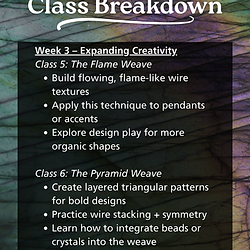 To enroll in this course, go back a page & scroll down to view payment plans ๐ซ 8 one hour classes (recorded live). Step by step instruction for pendants, stone setting & wire wrapping necklace frames. ๐ฅ Lifetime access: Watch and rewatch anytime inspiration strikes. ๐ Guidance from Sara Carreau (SoulSunshine) Reiki Master Teacher & jewelry artist. ๐ชถ Tools, tips & techniques for intuitive design and crystal selection. ๐ Creative & energetic alignment woven throughout each lesson. ๐ฌ Community access: Stay inspired and supported as you grow. ๐พ๐ก๐๐จ๐จ 1: ๐๐ค๐ค๐ก๐จ, ๐๐๐ง๐, & ๐ฝ๐๐จ๐๐๐จ Learn about wire types, pliers, and crystals. Practice loops, bends, and wire control. Build confidence with hands on exercises ๐พ๐ก๐๐จ๐จ 2: ๐๐๐ ๐๐๐ข๐ฅ๐ก๐ ๐๐ฌ๐๐จ๐ฉ ๐พ๐๐๐ Create your first pendant by caging a crystal. Practice tension, symmetry, and neat wrapping. Tips for finishing cleanly without sharp edges ๐พ๐ก๐๐จ๐จ 3: ๐๐๐ ๐ฝ๐๐จ๐ ๐๐ฉ ๐๐๐๐ซ๐ Weave a structured base that supports your stone. Explore variations for flat vs. dimensional designs. Practice stabilizing crystals with wrap points ๐พ๐ก๐๐จ๐จ 4: ๐๐๐ ๐พ๐ค๐๐ก๐๐ฃ๐ ๐๐๐๐๐ฃ๐๐ฆ๐ช๐ Learn single + double wire coiling for texture. Use coils as both structural + decorative elements. Troubleshoot wire kinks and breakage ๐พ๐ก๐๐จ๐จ 5: ๐๐๐ ๐๐ก๐๐ข๐ ๐๐๐๐ซ๐ Build flowing, flame like wire textures. Apply this technique to pendants or accents. Explore design play for more organic shapes ๐พ๐ก๐๐จ๐จ 6: ๐๐๐ ๐๐ฎ๐ง๐๐ข๐๐ ๐๐๐๐ซ๐ Create layered triangular patterns for bold designs. Practice wire stacking + symmetry. Learn how to integrate beads or crystals into the weave ๐พ๐ก๐๐จ๐จ 7: ๐พ๐ค๐ข๐๐๐ฃ๐๐ฃ๐ ๐๐๐๐ซ๐๐จ ๐๐ฃ๐ฉ๐ค ๐๐ฃ๐ ๐ฟ๐๐จ๐๐๐ฃ Transition between multiple techniques in one piece. Create a full pendant start to finish. Add embellishments for a personalized touch ๐พ๐ก๐๐จ๐จ 8: ๐๐ค๐ช๐ง ๐๐๐๐ฃ๐๐ฉ๐ช๐ง๐ ๐๐๐๐๐ + ๐๐๐ค๐ฌ๐๐๐จ๐ Design + wrap your own unique final project. ๐ ๐๐จ๐ฎ๐ซ ๐๐ง๐ฏ๐๐ฌ๐ญ๐ฆ๐๐ง๐ญ Pay in Full: $250 (๐ก๐๐ข๐๐ฉ๐๐ ๐๐ฃ๐ฉ๐ง๐ค๐๐ช๐๐ฉ๐ค๐ง๐ฎ ๐ฅ๐ง๐๐๐) Bi-Weekly Plan: 2 payments of $123.50 Bi-Weekly Plan: 3 payments of $82.33 Regular price: $297 โ enroll now & save ๐ป ๐ ๐๐ญ๐ฎ๐๐๐ง๐ญ ๐๐จ๐ฏ๐ โSara doesnโt just teach wire wrapping, she teaches creative freedom.โ โThis course gave me the confidence to start selling my jewelry.โ โEvery lesson felt like art therapy & spiritual alignment in one."